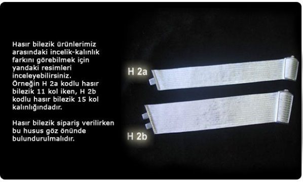 Hasır Bilezik: Hasır bilezikler 9, 11, 13 ve 15 sıralı (kol) olarak inceden kalına doğru üretilmektedir. Ağırlıkları ürünün incelik ve kalınlığına göre değiştiği için fiyatları da buna göre değişmektedir. Hasır bileziklerin yaklaşık ağırlıkları 30 gr ile 60 gr arasında değişmektedir.